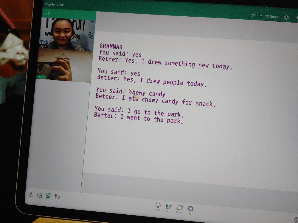 선생님과 많이 친해져서 웃으면서 대화하는 모습이 보기 좋습니다. 중간에 버벅거리면 선생님께서 알려주시고 아이도 잘 ...