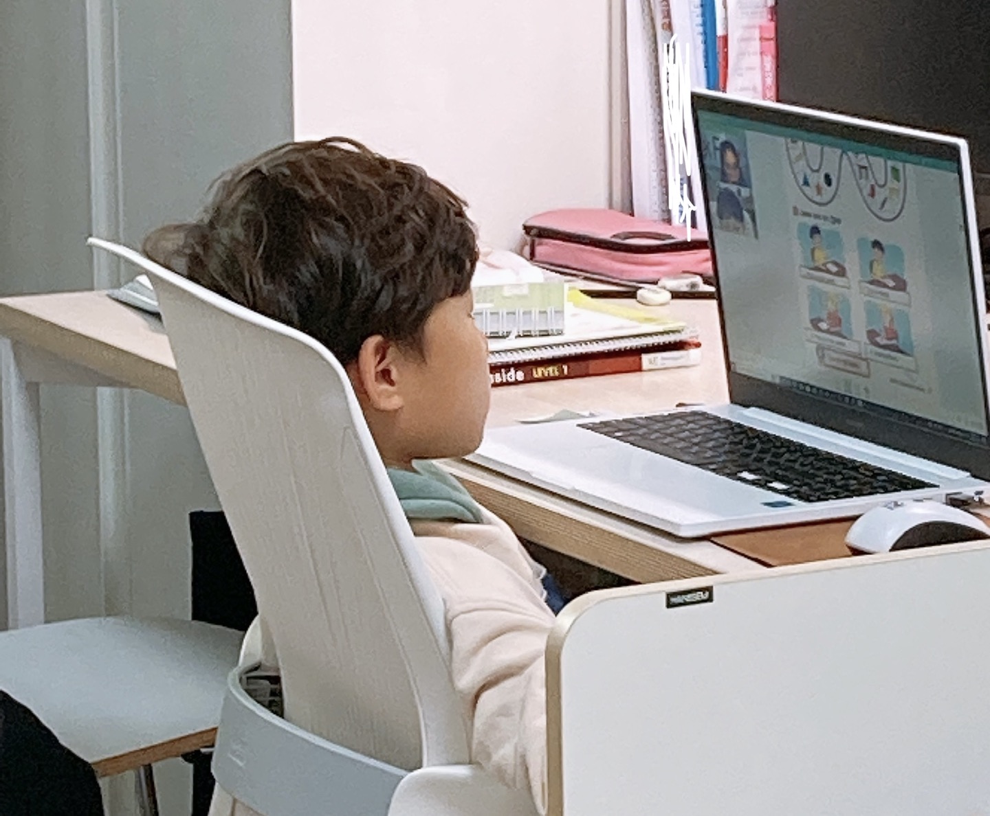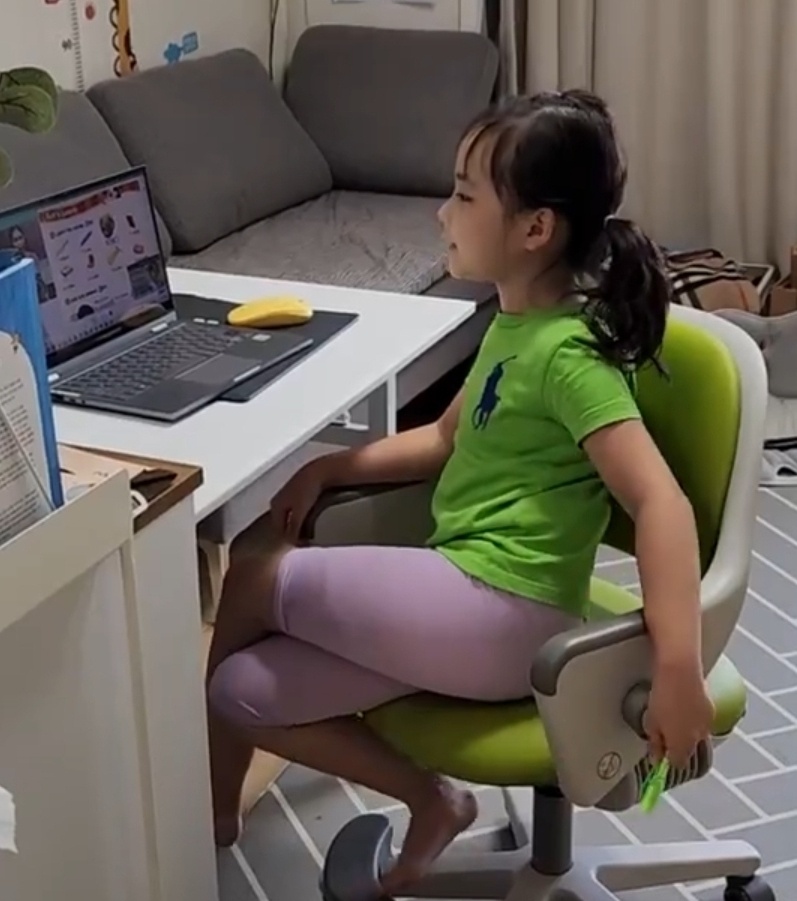 놀이터에서 친구와 놀고 싶은데 화상영어 시간 되어 데려왔더니 수업 시간 25분 내내 우는데 물 마시 라며 달래주고...