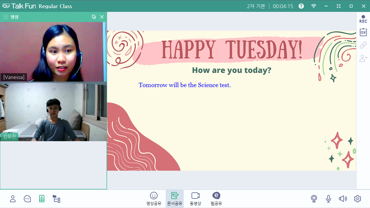 Peach 선생님과의 수업은 즐겁고 재미있습니다. 선생님께서 열심히 이끌어주셔서 발화에도 도움이 된다고 생각되네요...