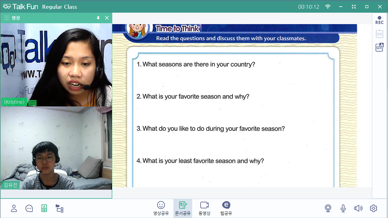 벌써 3번째 재수강이네요 아직도 대답은 단답형이지만 선생님이 인사말해주면 몇마디 알아듣긴 해요 ㅎㅎ 조금씩 변화되...