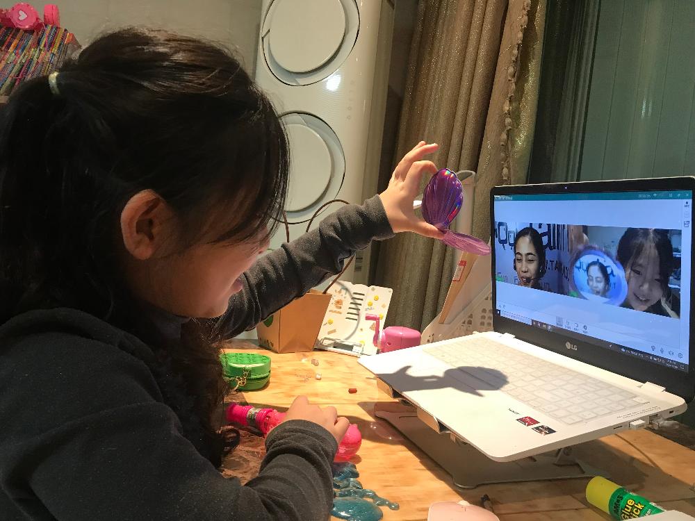 미술 학원에서 작품 만들어 오는 날은 제이미 선생님에게 본인이 만든 미술 작품 설명하느라 한참을 웃고 떠들어요 선생님...