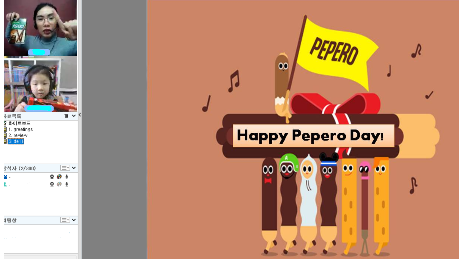 여전히 화기애애한 수업을 하고 있습니다. 빼빼로 데이에 강사님과 아이가 서로 빼빼로를 준비해서 보여줬었답니다. 만...
