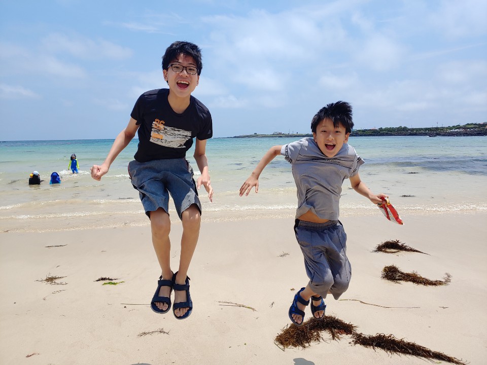 제주의 바다는 너무 맑고 깨끗합니다. 아이들은 모래와 짠바다 짠냄새가 싫은지 모래놀이만 한시간 즐기네요 작은아이는...