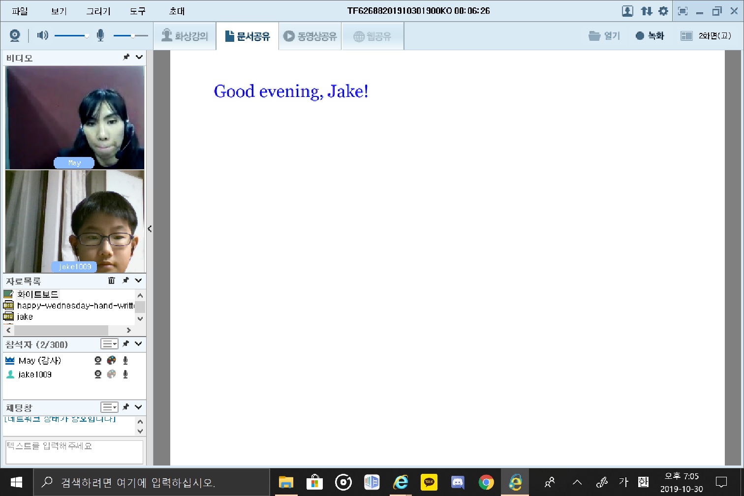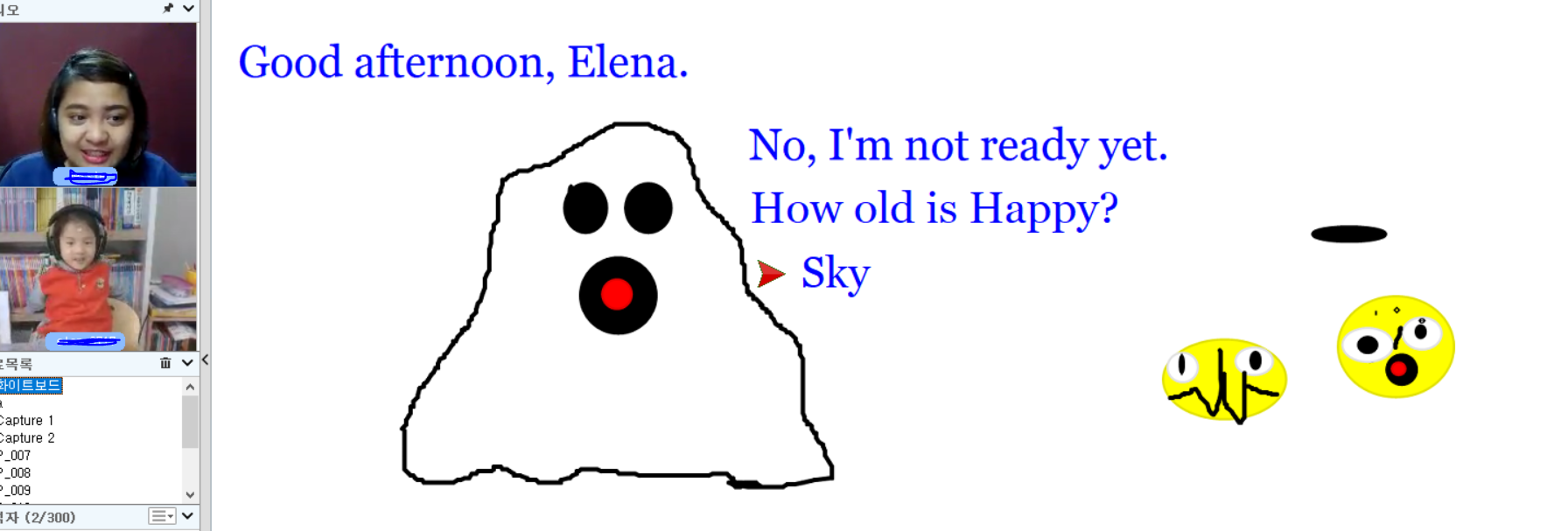 일주일에 2회 꾸준히 하고 있습니다. 때로는 노래도 부르고 선생님께 그림을 그려서 보여드리기도 하고 나름 재미있게 수...