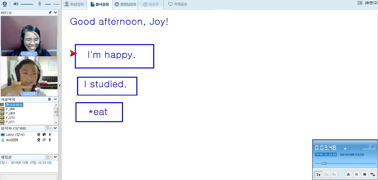 이번에 새로운 Jeanell선생님하고 한 달동안 공부했는데 정말 즐거웠다. 그래서인지 영어도 훨씬 늘고