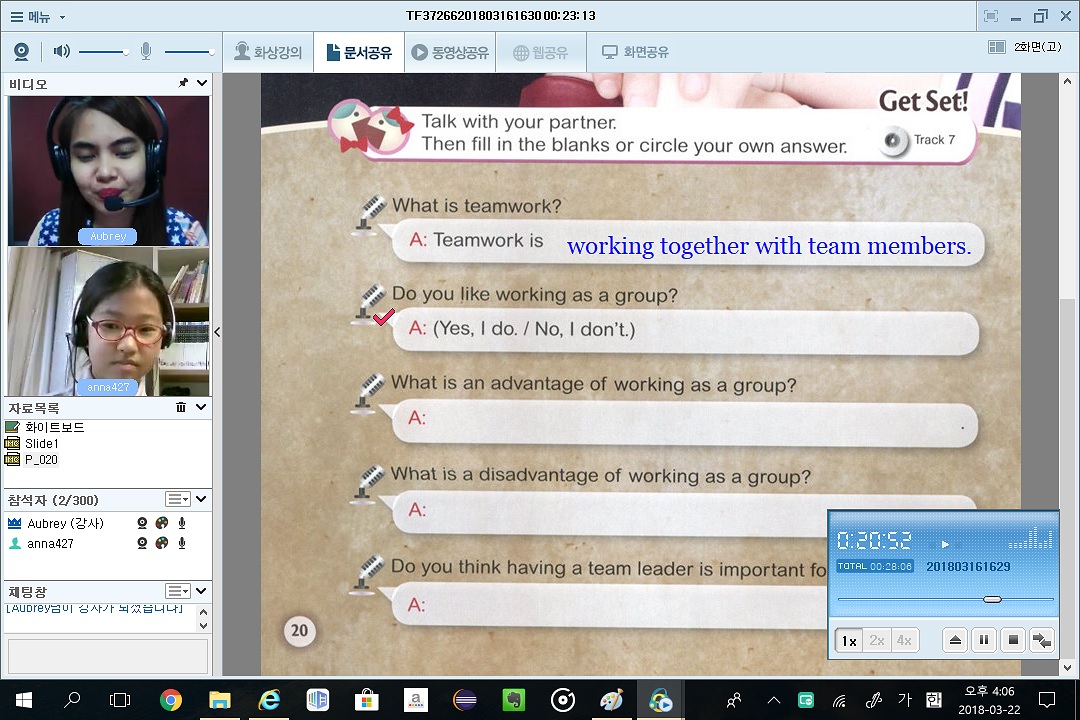 이제 토크펀 한지 1개월 돼요. 그동안 Charlene선생님과 speech like me2 라는 교재로 너무 재미있...